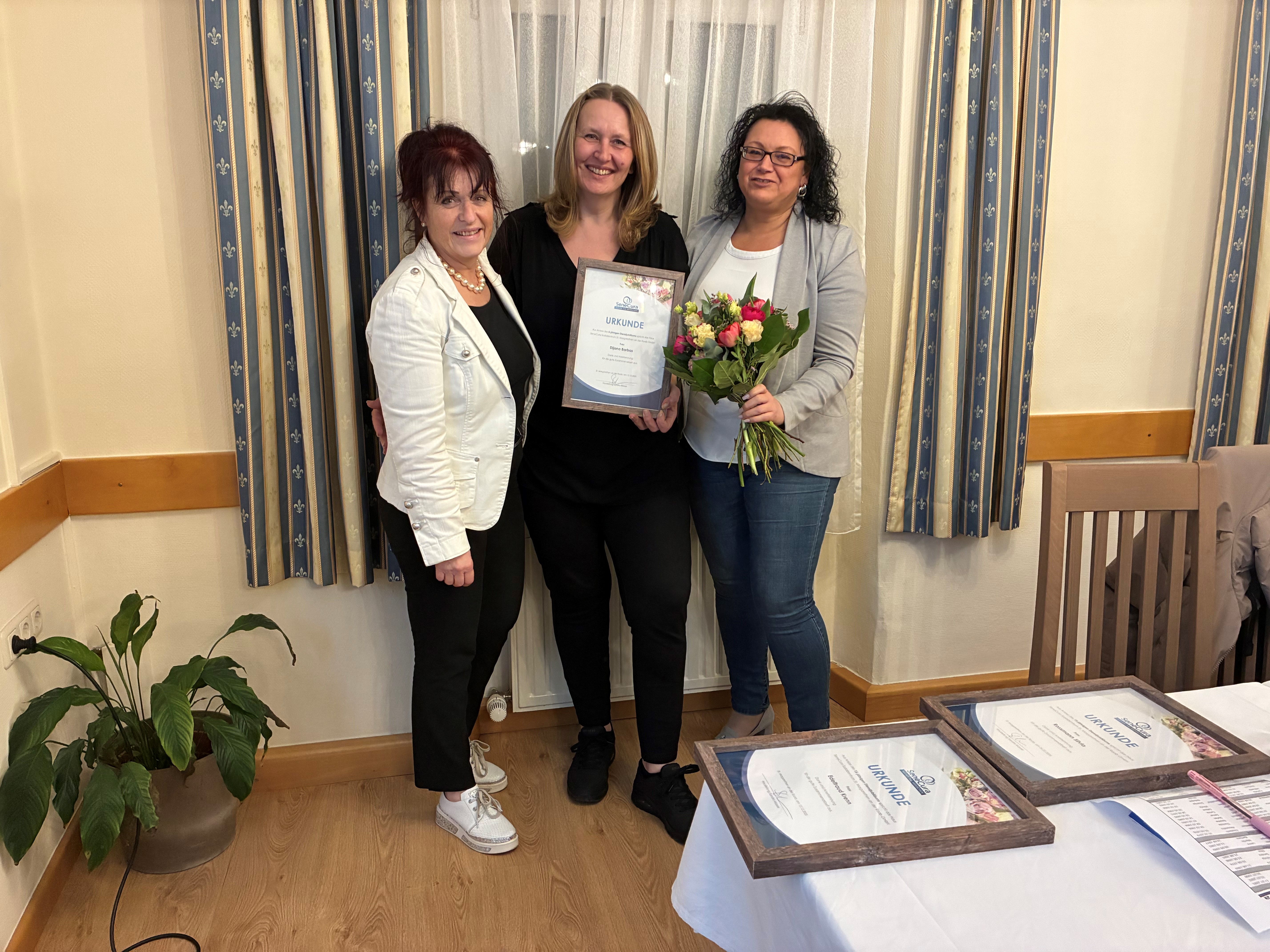 Silvia Rossmann aus der Wäscherei ist bereits seit 15 Jahren Teil des Hauses und sorgt mit ihrem Einsatz täglich für Ordnung und Wohlbefinden. Ebenfalls seit 15 Jahren unterstützt Edeltraud Krenn als Pflegeassistentin mit viel Engagement und Herz die Betreuung der Bewohnerinnen und Bewohner. Dijana Barbas, diplomierte Gesundheits- und Krankenpflegerin (DGKP), feierte ihr 5-jähriges Jubiläum und ist eine wertvolle Stütze im Pflegeteam.